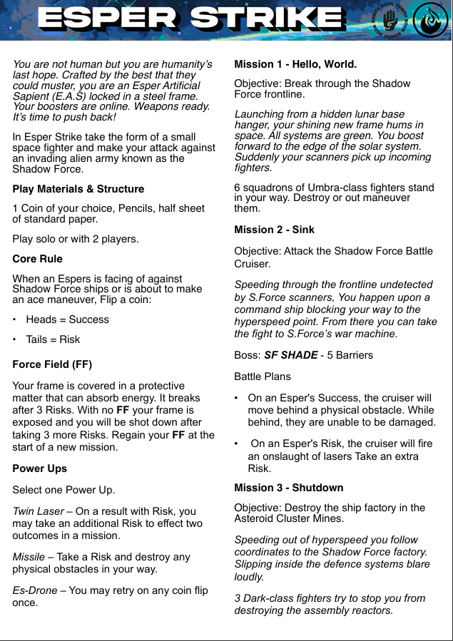 Esper Strike is a sci-fi solo or duo ttrpg where all you need is one coin. Take the role of a small space fighter and face off againist the alien army known as the Shadow Force.